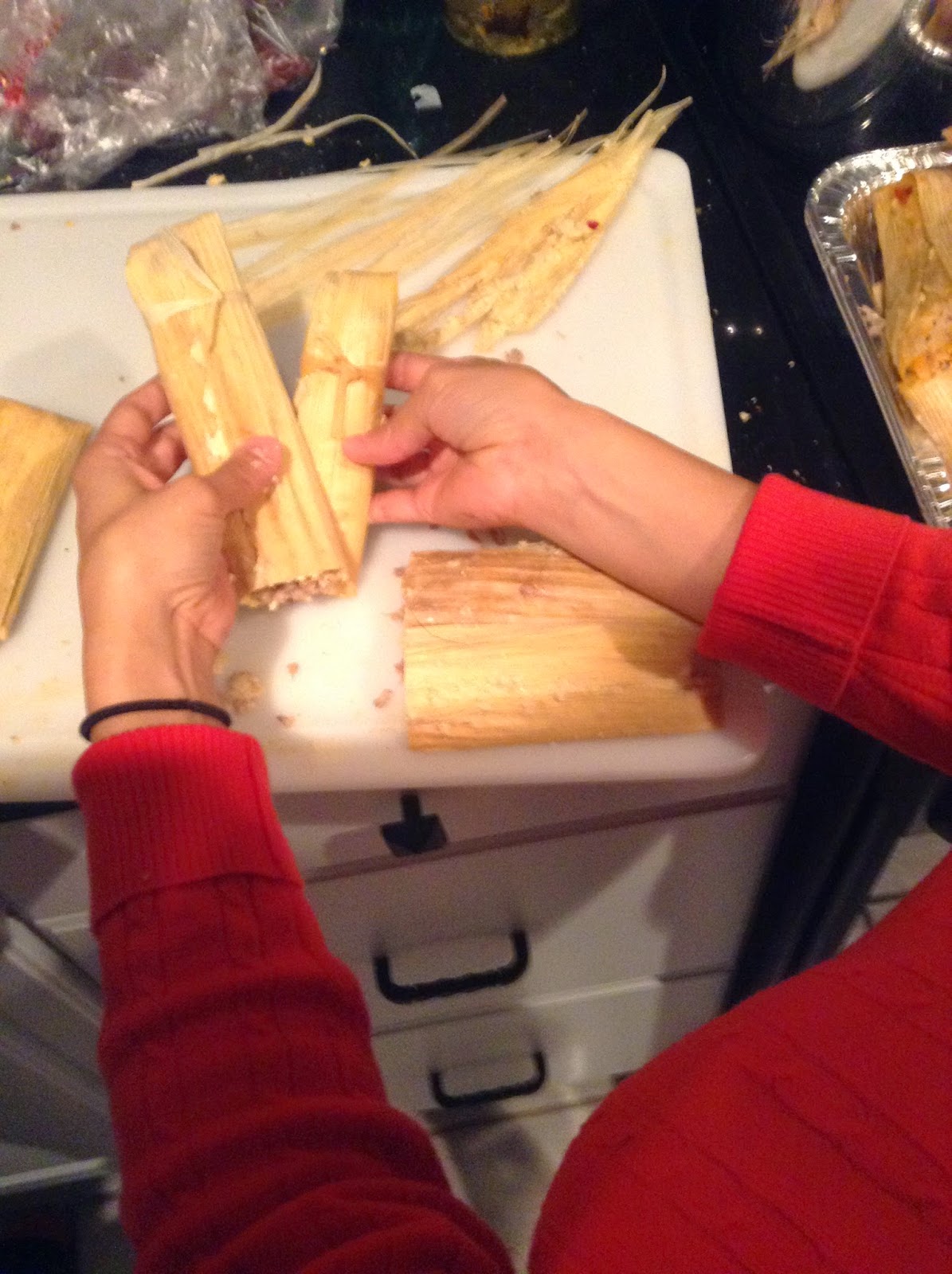 You take the back of the spoon and spread a thin, even layer on the "smooth" side of the corn husk (its hard to tell which is the smooth side). If you do it on the wrong side, it makes it difficult to pull off when eating. These are the ones we used.